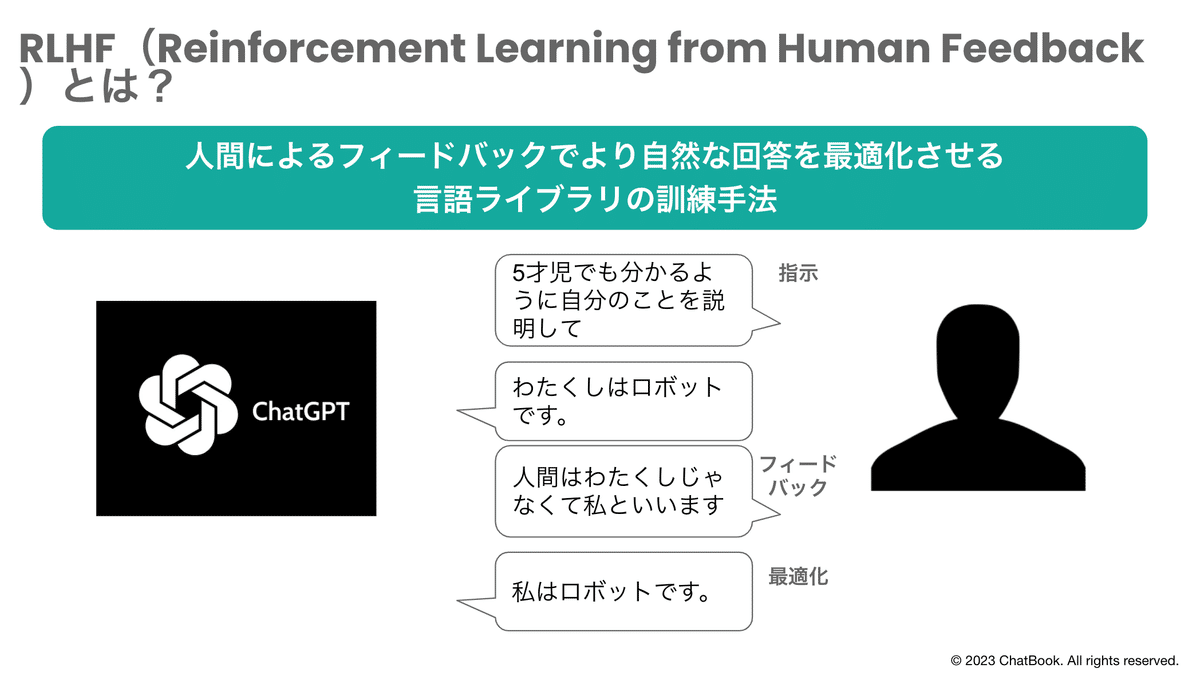 なお、ChatGPTは人間による強化学習を経て桁外れの会話精度となった。